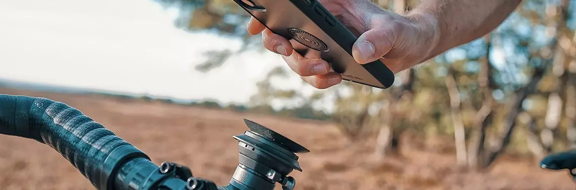 Ten system mocowania telefonu do roweru ma albo obejmę na kierownicę, albo mocowanie zamiast korka sterów. Do nich pasują przyklejana na własną obudowę nakładka, w ofercie jest też worek hermetyczny ze zintegrowanym magnesem. My natomiast testowaliśmy rozwiązanie z przeznaczoną do konkretnego modelu obudową. W ofercie są osłony pasujące do iPhone’a 13, 12, 11, 8 i SE2 oraz Galaxy S20 i S21 we wszys...