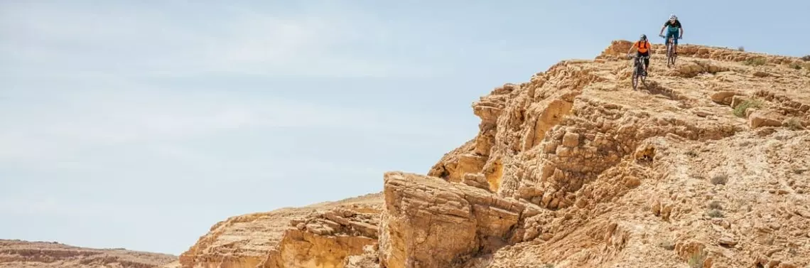 Pakujemy to, co zostało z naszego śniadania, i wskakujemy na rowery. Nasi izraelscy przyjaciele dają z siebie wszystko. Potrzebujemy trochę czasu, aby przyzwyczaić się do tego śliskiego i skalistego terenu. Najpierw chcą pokazać nam szlak, który jeszcze nie jest oficjalny. Nie możemy się doczekać. Zatrzymujemy się i usta otwierają się nam szeroko już po zaledwie 10 minutach. Jej! Ogromny wąwóz pojawia się tuż przed nami. Otwór jest głęboki, z tarasowymi formacjami skalnymi z żółtego piaskowca po obu stronach. Przypomina Wielki Kanion lub Dolinę Kali Gandaki w Nepalu. Najlepsze jest jeszcze przed nami: po lewej stronie, wysoko nad wąwozem, biegnie szlak. Zawsze piekielnie blisko krawędzi i ponad wieloma tarasami. Marzenie się spełniło! Rzecz w tym, że niewiele tu może pójść źle. Na niektórych odcinkach nie można przejechać na szerokość kierownicy, co chroni przed upadkiem.