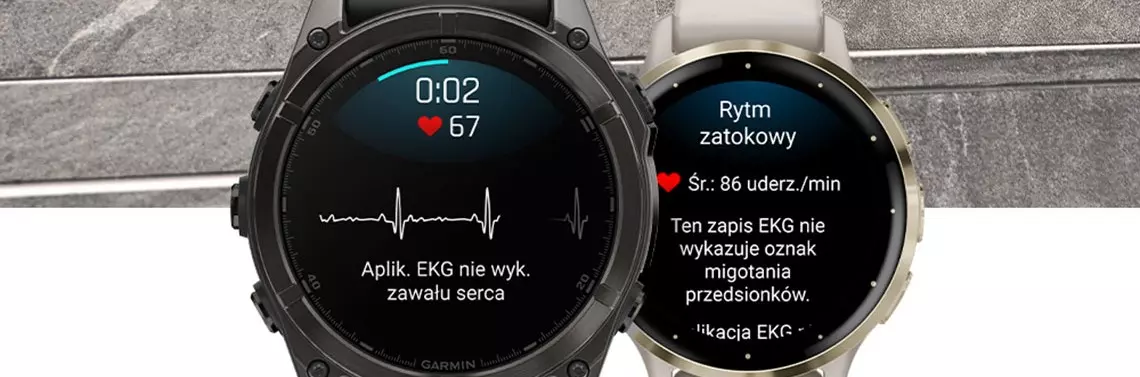 ¹ Aplikacja EKG umożliwia rejestrowanie EKG podobnego do EKG odprowadzenia I oraz wykrywanie obecności migotania przedsionków lub normalnego rytmu zatokowego. Aplikacja EKG jest przeznaczona wyłącznie dla osób dorosłych w wieku 22 lat i starszych. Aplikacja EKG nie jest przeznaczona do zastąpienia tradycyjnych metod diagnozy lub leczenia. W przypadku wykrycia migotania przedsionków należy skonsultować się z lekarzem. Jeśli wystąpią objawy zawału serca, udaru mózgu lub innych chorób układu krążenia, nie polegaj na powiadomieniach urządzenia i skonsultuj się z lekarzem. Zawsze postępuj zgodnie z instrukcjami użytkowania. Aplikacja EKG nie jest dostępna we wszystkich regionach i jest dostępna wyłącznie na wybranych smartwatchach Garmin z najnowszą wersją aplikacji Garmin Connect na smartfony oraz oprogramowaniem zegarka. Informacje o dostępności i pełne instrukcje użytkowania znajdują się na stronie Garmin.com/ECG. Aplikacja EKG jest urządzeniem medycznym klasy IIa zgodnie z Rozporządzeniem UE w sprawie wyrobów medycznych (MDR) (UE) 2017/745.