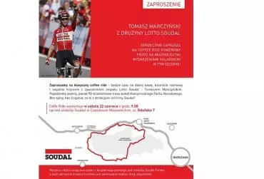 W sobotę 22 czerwca 2019 roku w podwarszawskim Cząstkowie Mazowieckim odbędzie się pierwszy w historii Coffee Ride z udziałem wielokrotnego Mistrza Polski w kolarstwie, zawodnika zespołu Lotto Soudal – Tomasza Marczyńskiego. Start zaplanowano na godz. 9.00, natomiast zakończenie – ok. 14.00. To impreza, na której amatorzy kolarstwa nie tylko spędzą aktywnie czas z zawodowym kolarzem Lotto Soudal, ale także będą mogli wykonać bezpłatny przegląd i serwis swoich rowerów!
